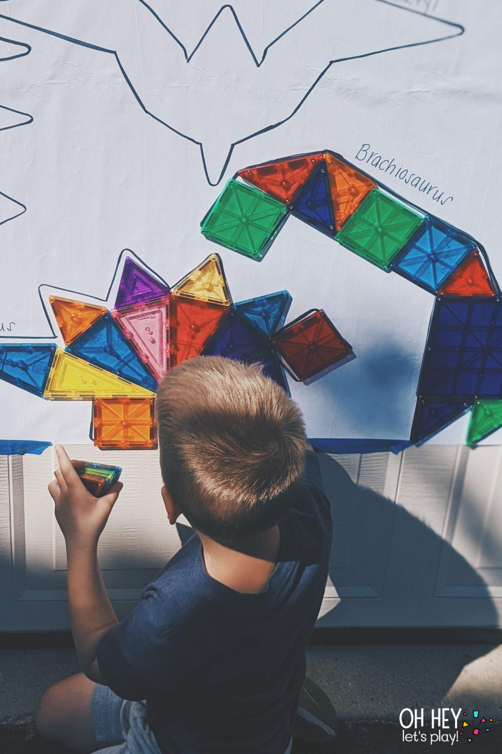 I had created each dinosaur with the magnatiles myself the night before and traced around them. I set aside the tiles used to make each dino and labeled them so I could provide the kiddos with exactly what they’d need to build each magnatile dinosaur. Tatum (2) kind of just put tiles wherever she wanted and I was fine with that- Kade (4) was mainly the one completing the “puzzles” and even he needed a few tips/hints along the way. It was so fun though and working on a vertical surface is always a great way to switch up your play. I talk a little more about the benefits of working at a vertical surface in this blog post.