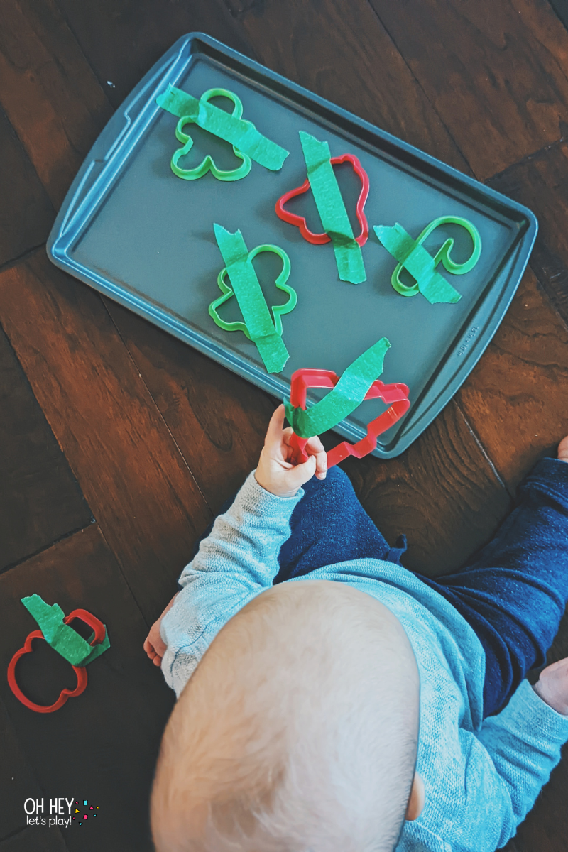 Tape plastic holiday cookie cutters to a baking tray using red & green painter’s tape. Let babies/toddlers “rescue” the cutters by peeling the tape.